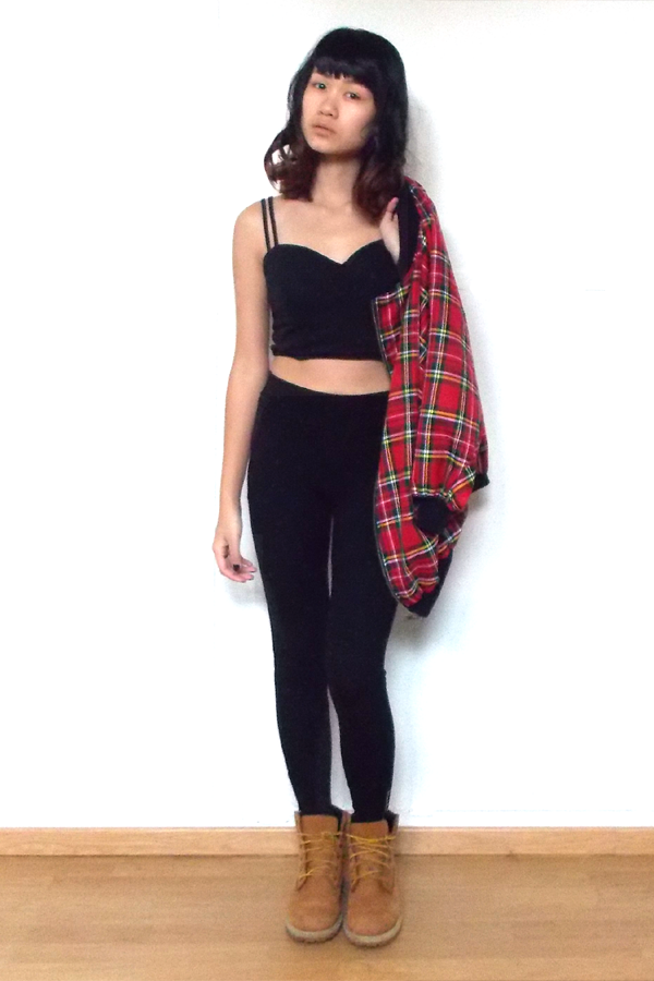 Monica Harmony bomber jacket – Minkpink – bustier top – ZARA black leggings – Timberland shoes