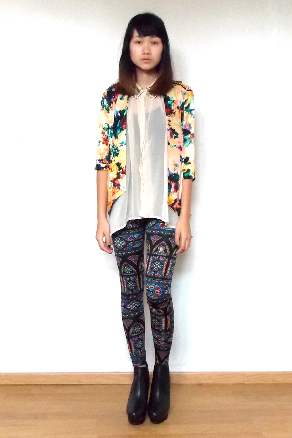 I was actually shopping for Dr. Martens when I came across this jacket. I immediately fell in love with the jacket. My adrenaline rush was telling me to buy it and I left the store with this jacket instead of Dr. Martens. The colors and the thin fabric makes it perfect for the spring and the studs give an edge to it. I just paired it with the cathedral printed leggings. At first I thought print on print will probably make my outfit too busy, but somehow the contrast between dark and light overpowers that, SCORE! The shoes are from ZARA and I bought it during the sales. They actually look a lot like the Jeffrey Campbell’s boots that I almost bought, but this cheaper version fills up the gap in the wallet! DOUBLE SCORE