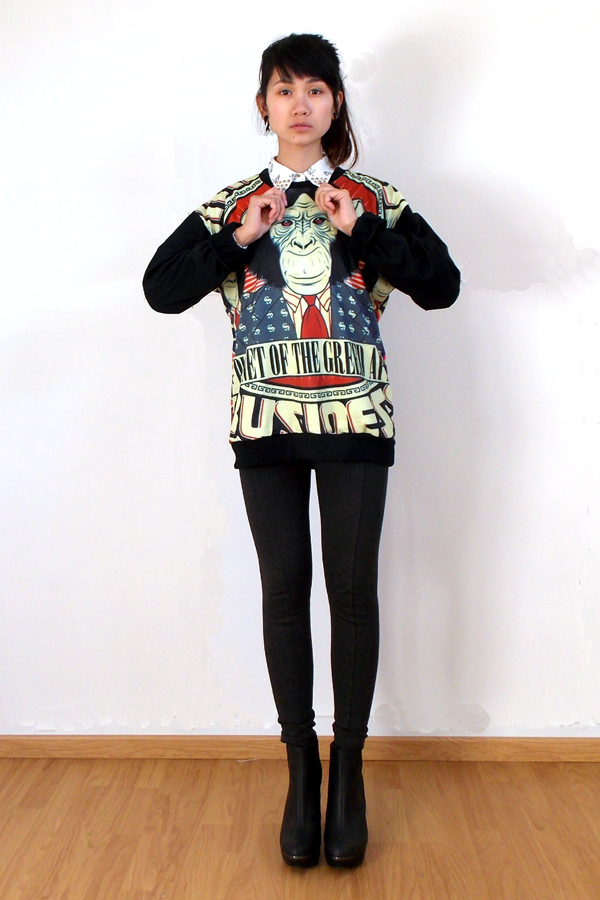 This sweater is about one thing: the monkey graphic. I love how it pops out and is in contrast with the black sleeves. What surprised the most is the back side. I thought the back was entirely black until I ripped the packaging open like a mad woman and found out that the back is also printed!