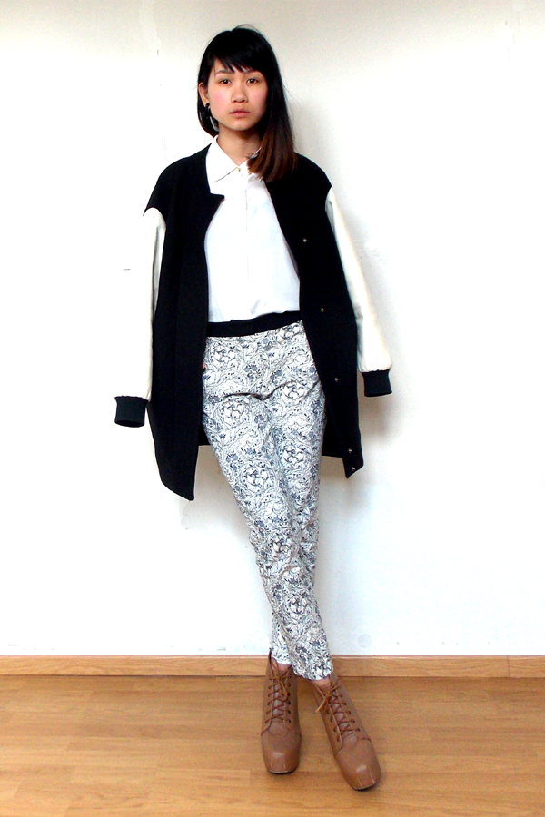 This was the outfit that I wore. I wanted something simple, but yet striking and appealing. A simple blouse with statement pants and heels, and my classy oversized baseball jacket draped over me!