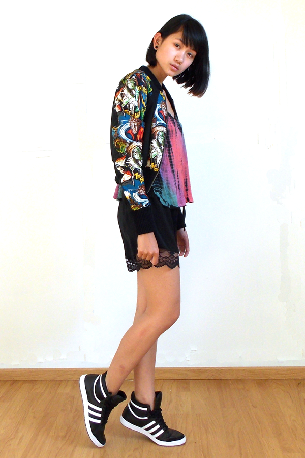 Pantheone jacket – Ecoté dipdye top – Pins & Needles shorts – Adidas sneakers